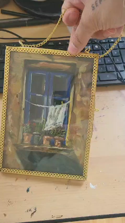 oil on glass panel within double-sided golden glass frame with chain.