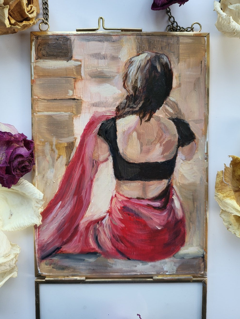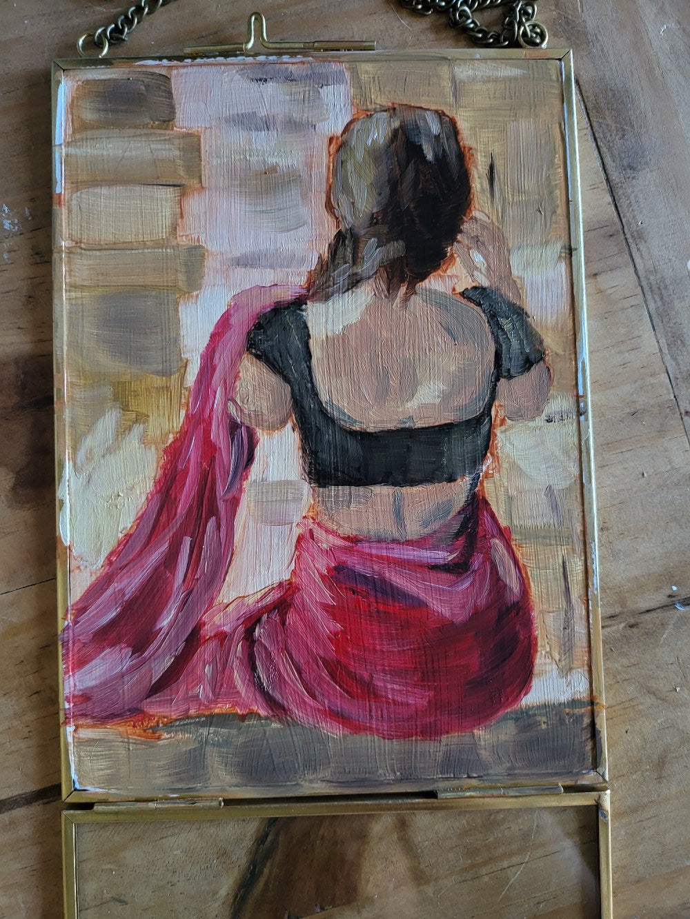 oil on glass panel within double-sided golden glass frame with chain.