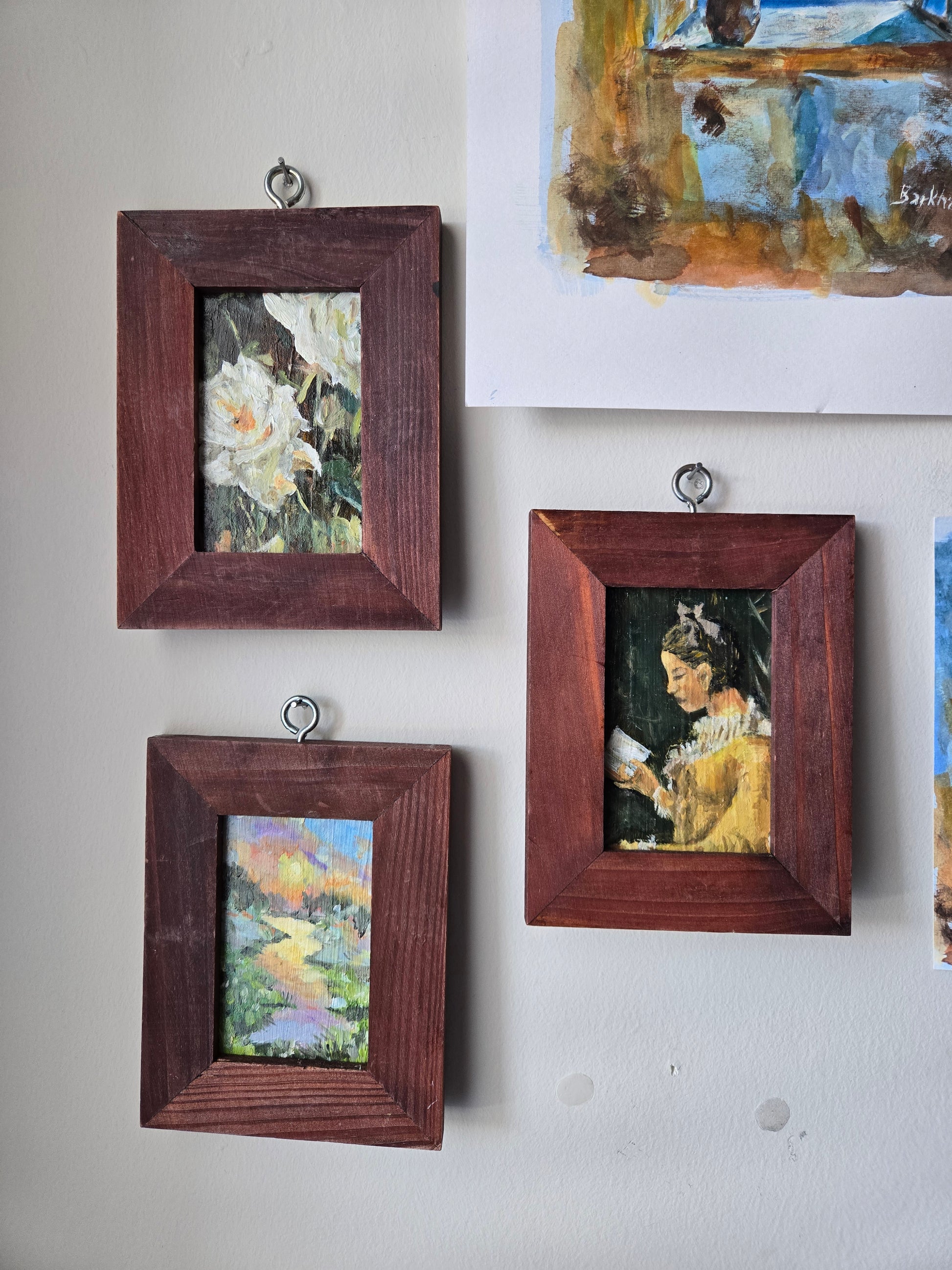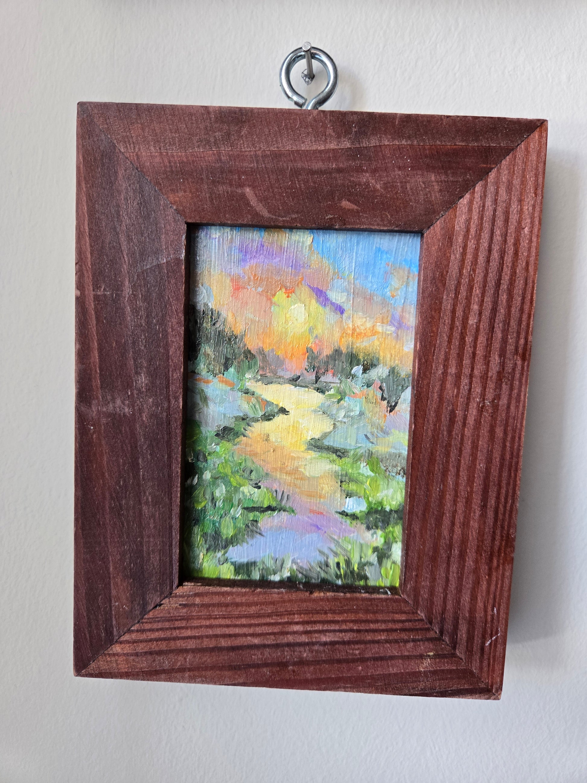 oil on glass in thrifted wooden frame with attached hook.